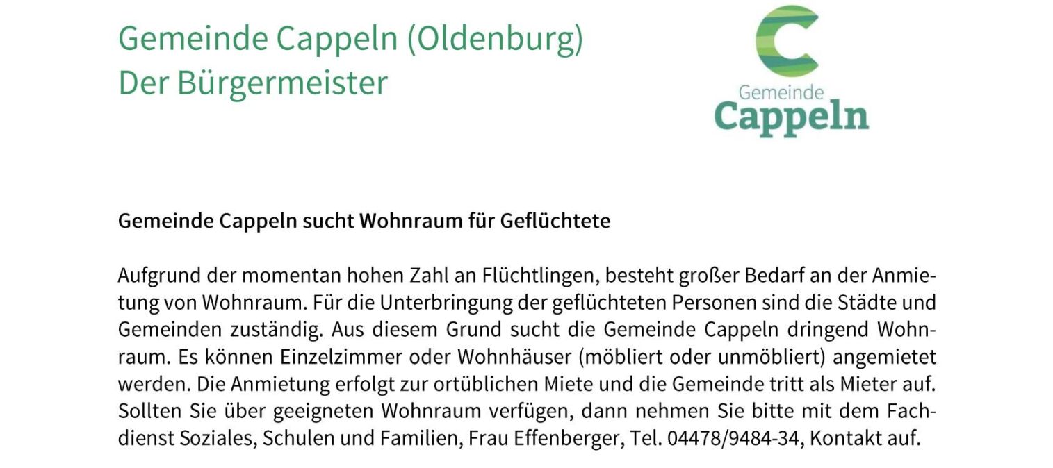 Gemeinde Cappeln sucht Wohnraum für Geflüchtete - Aufgrund der momentan hohen Zahl an Flüchtlingen, besteht großer Bedarf an der Anmietung von Wohnraum