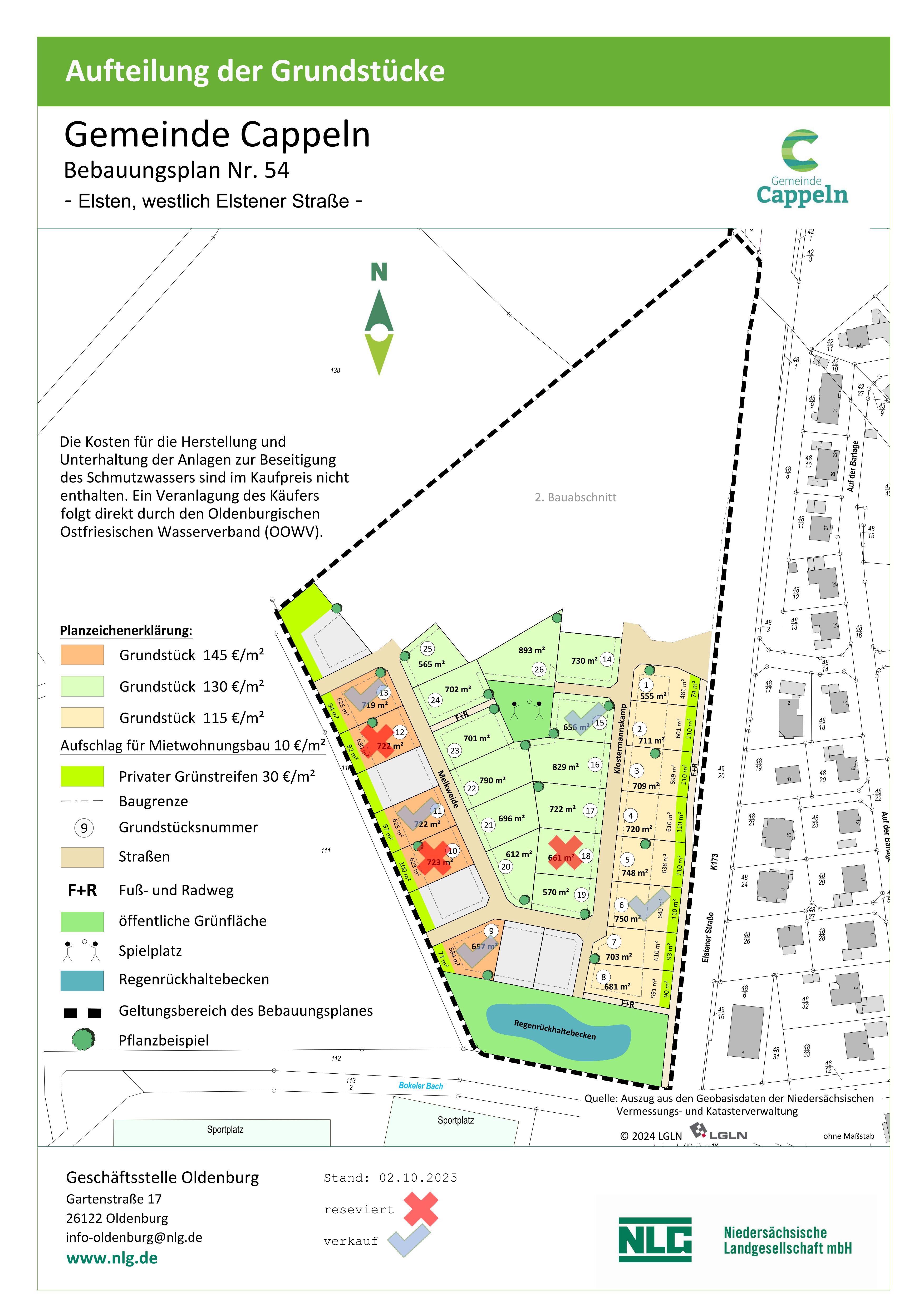 Die Gemeinde Cappeln (Oldenburg) bietet ab sofort Baugrundstücke im Baugebiet Nr. 54 – Elsten, westlich Elstener Straße – im 1. Bauabschnitt an.